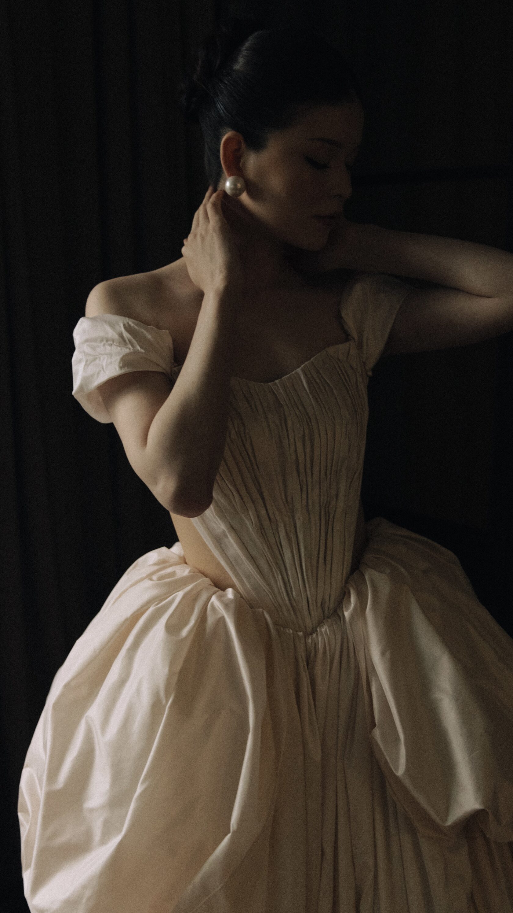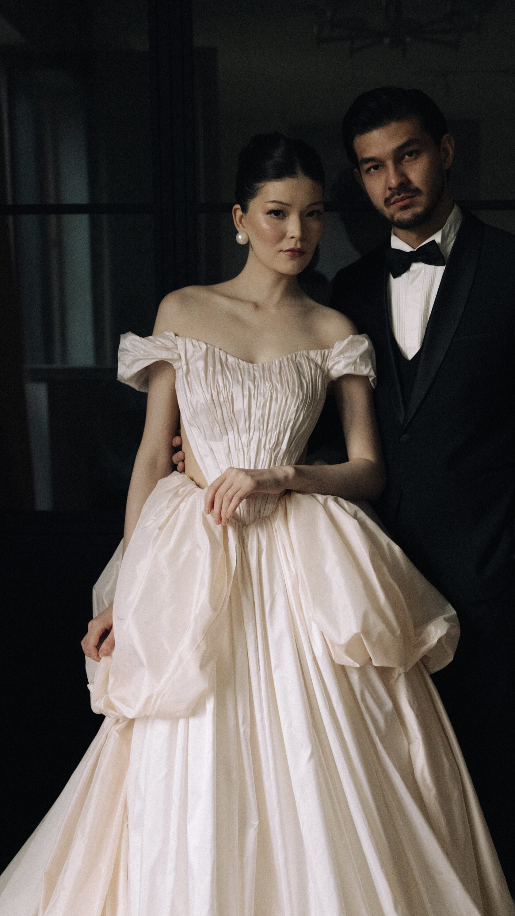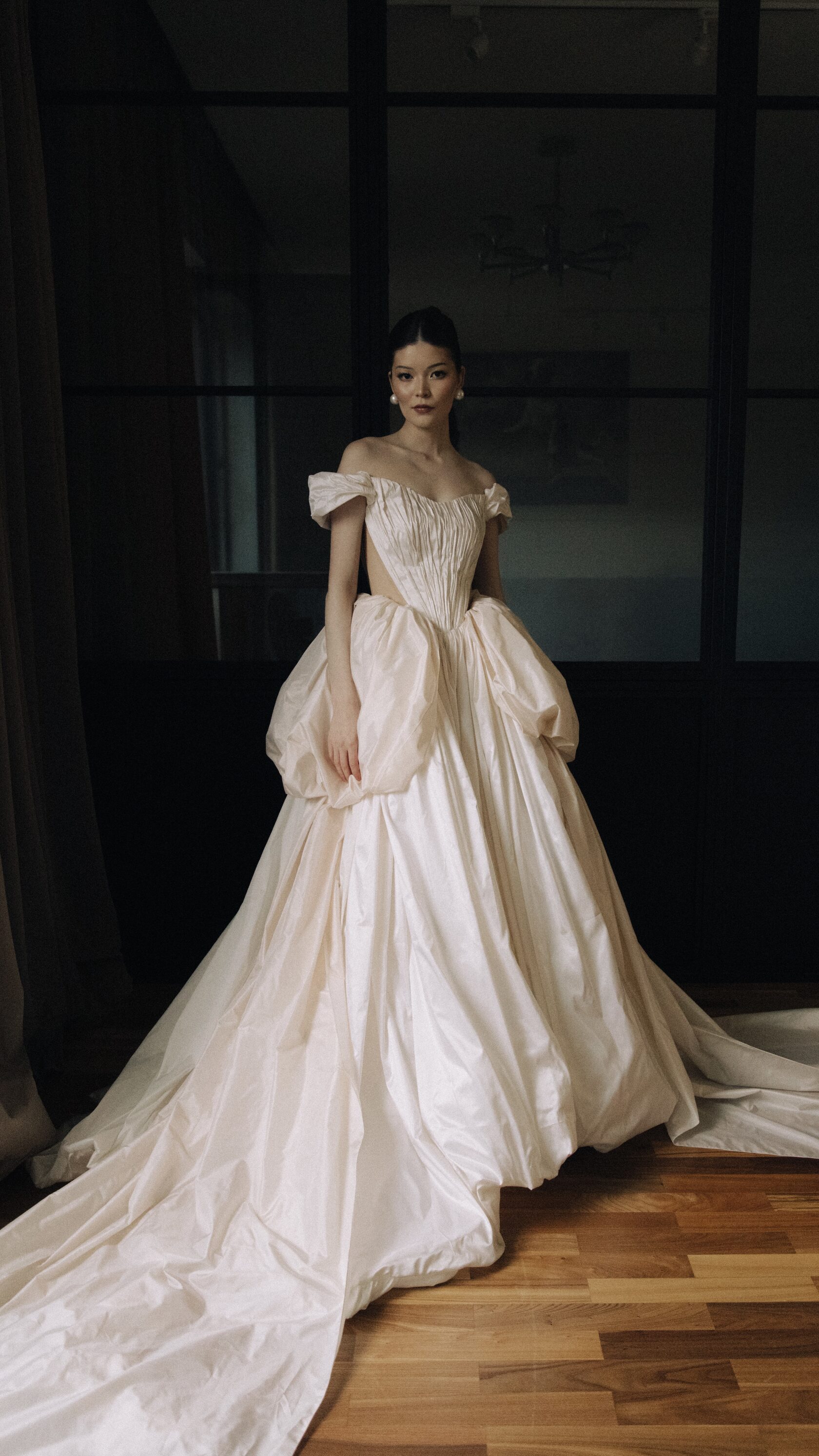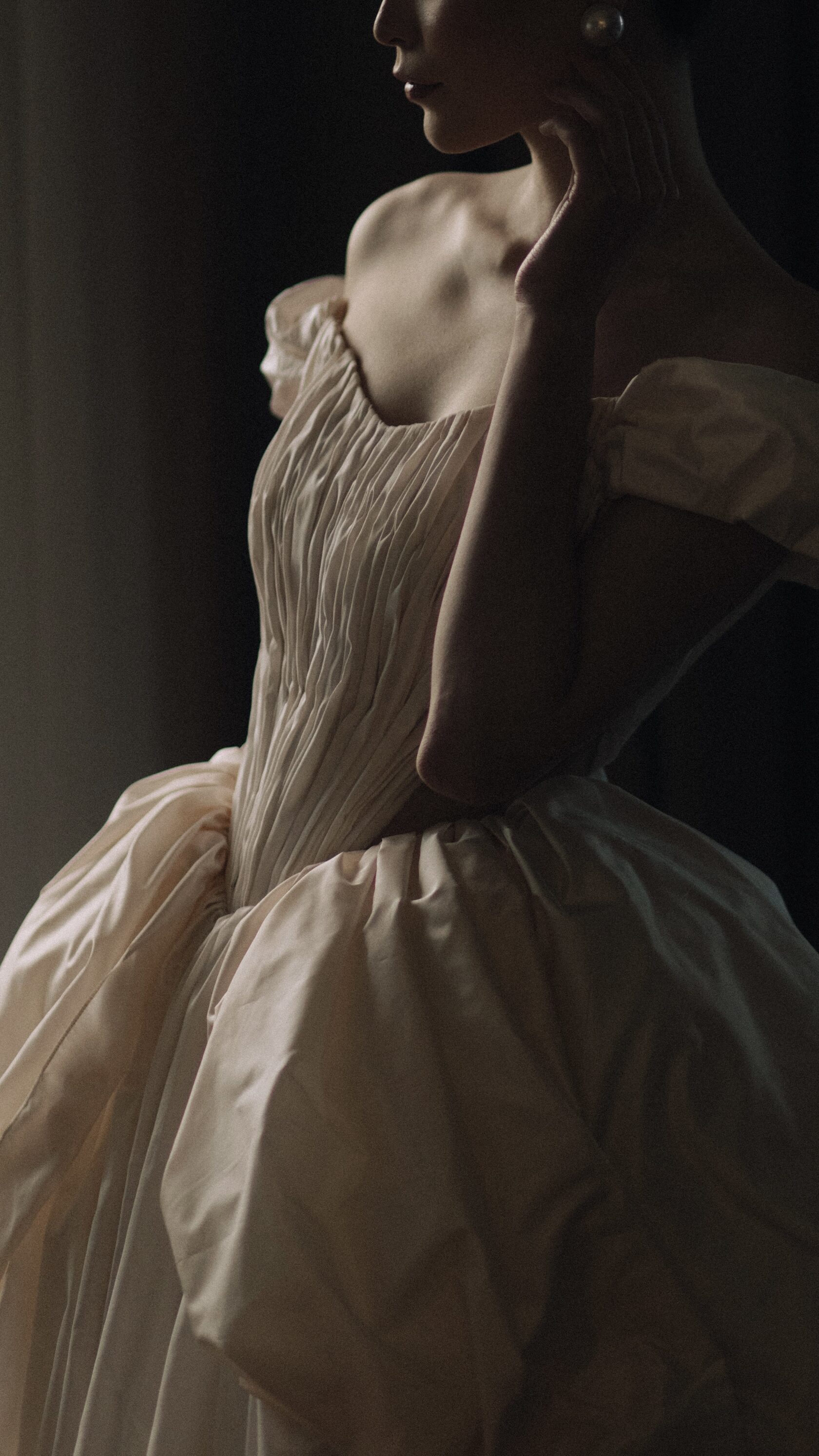 Этот образ - гармония современной нежности и архитектурных форм. Объёмные рукава придают образу драматичность, а мягкая драпировка юбки легко струится в движении, создавая торжественный и утончённый силуэт.