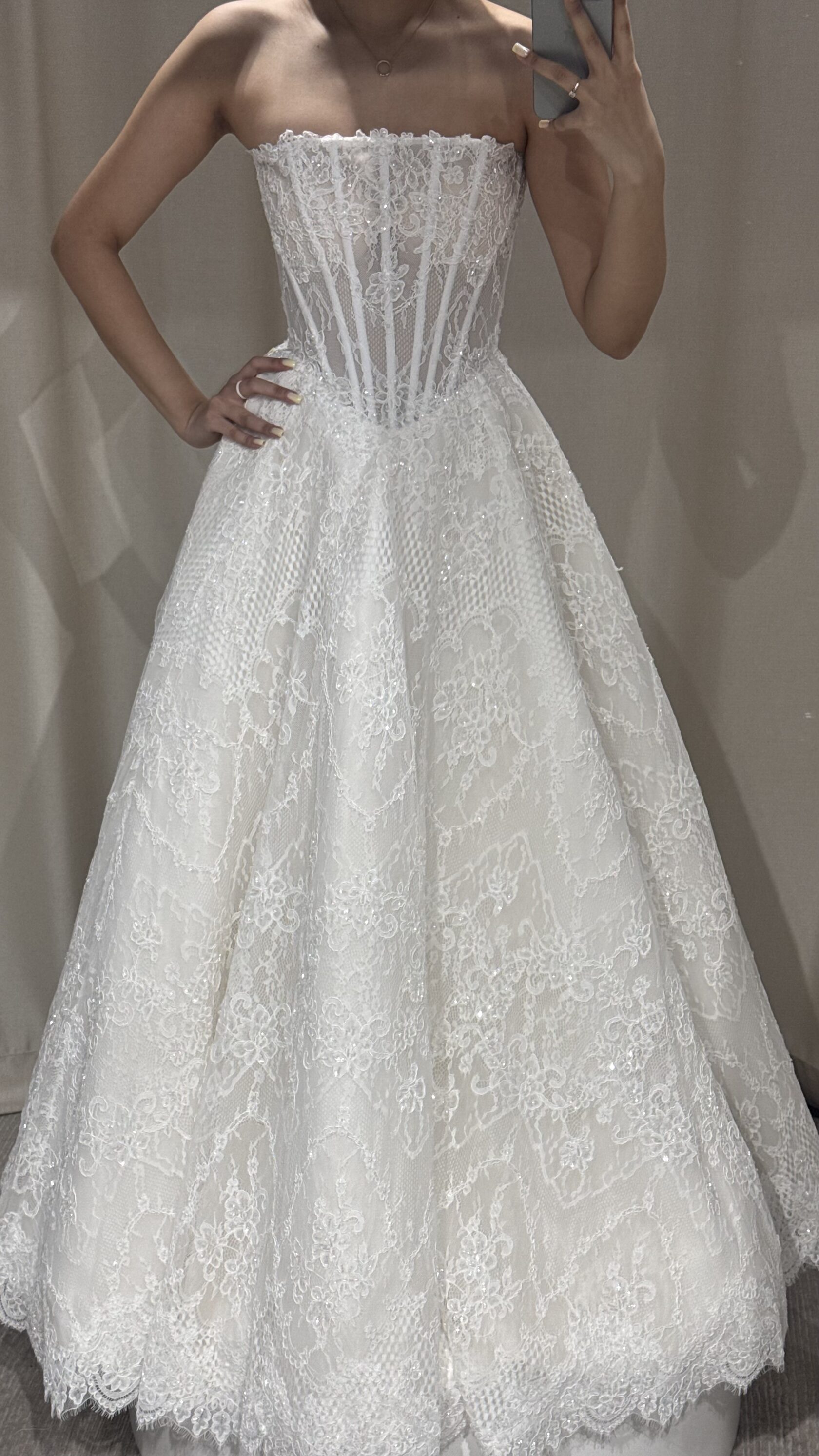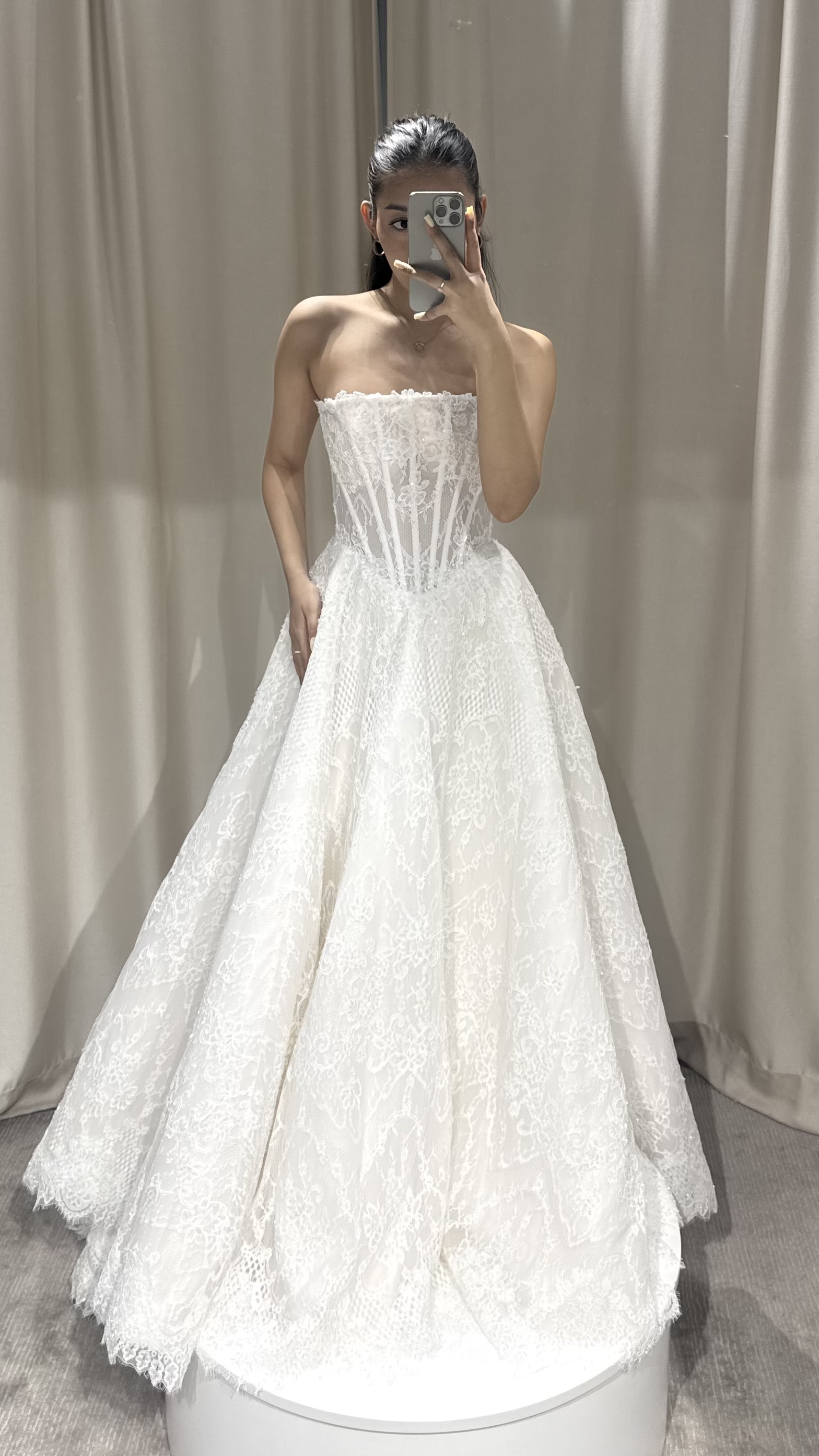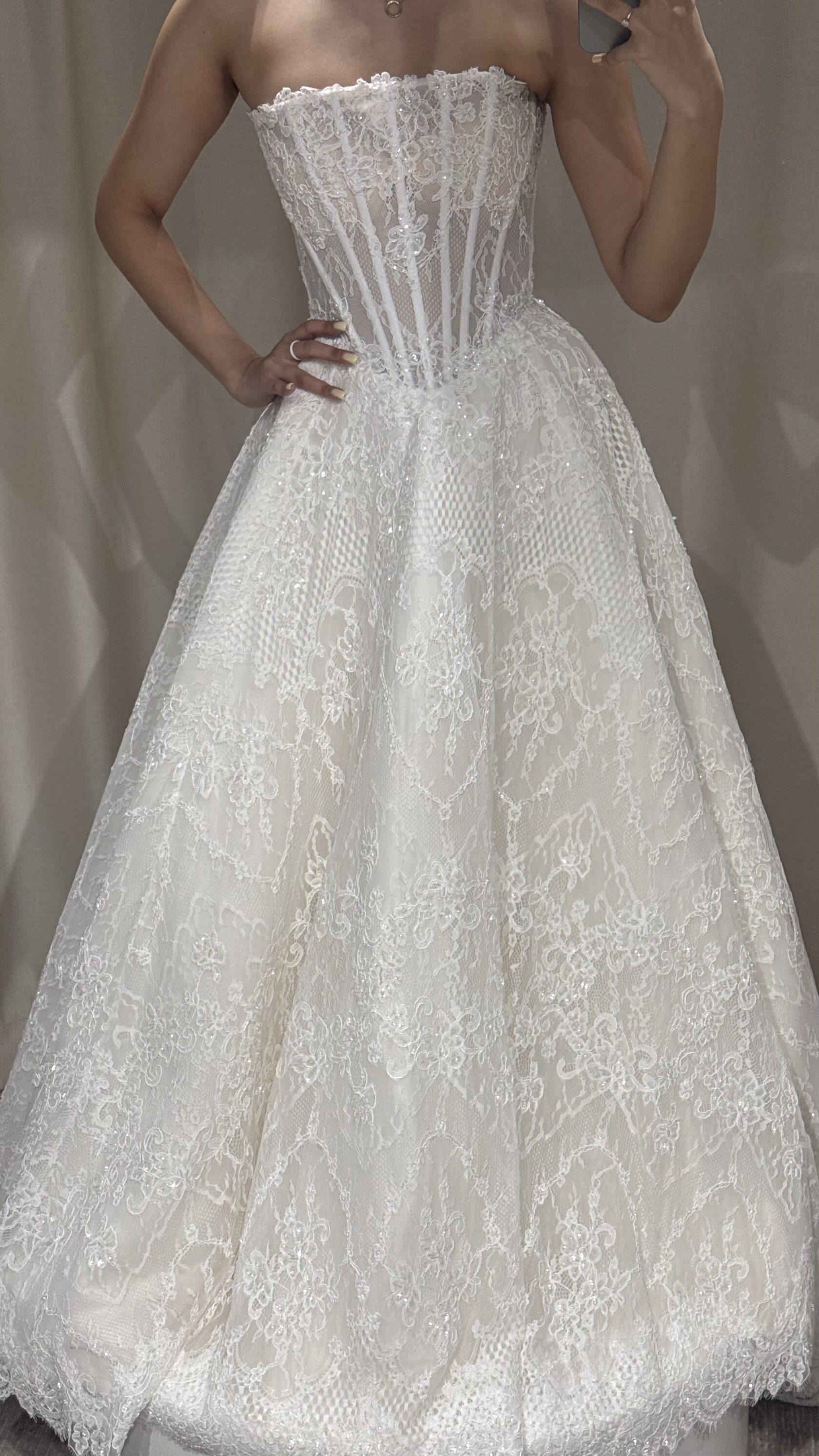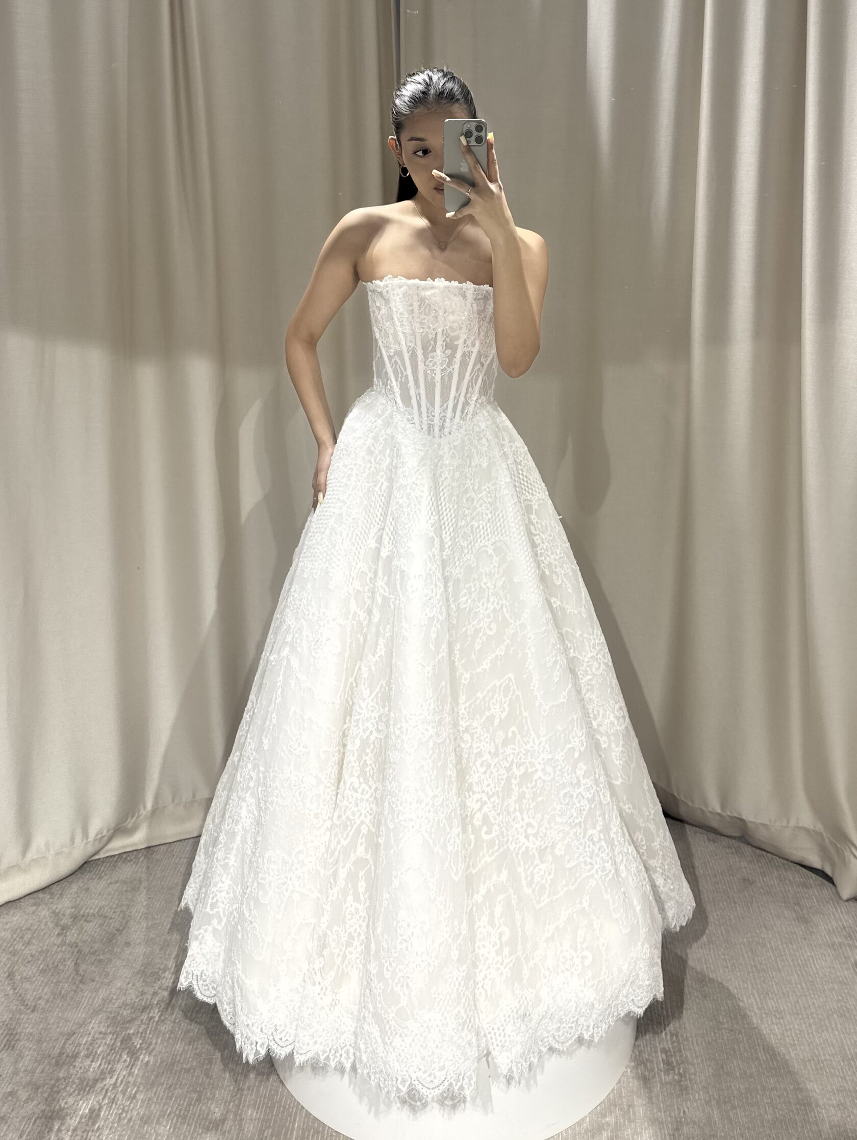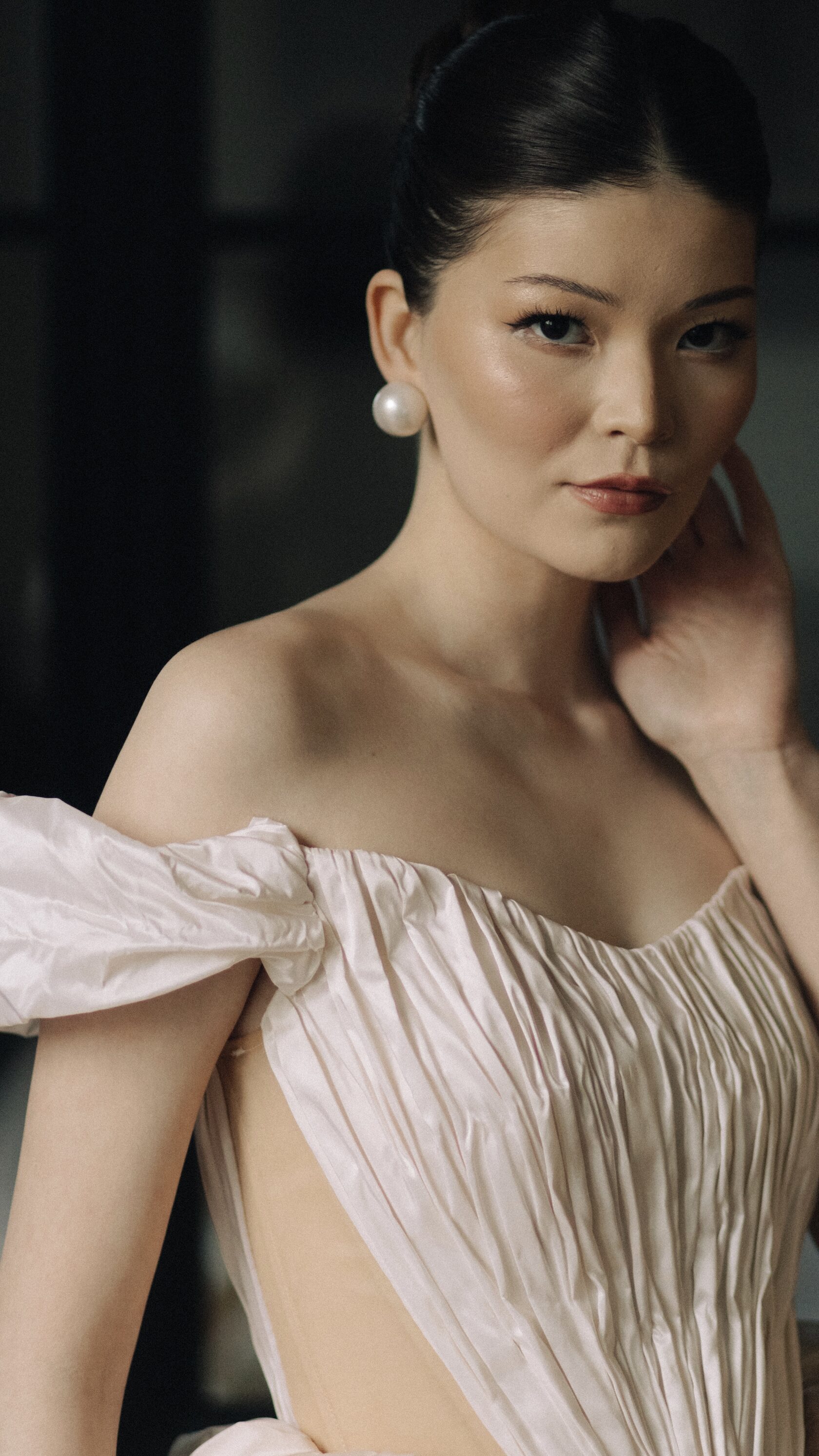 Этот образ - гармония современной нежности и архитектурных форм. Объёмные рукава придают образу драматичность, а мягкая драпировка юбки легко струится в движении, создавая торжественный и утончённый силуэт.