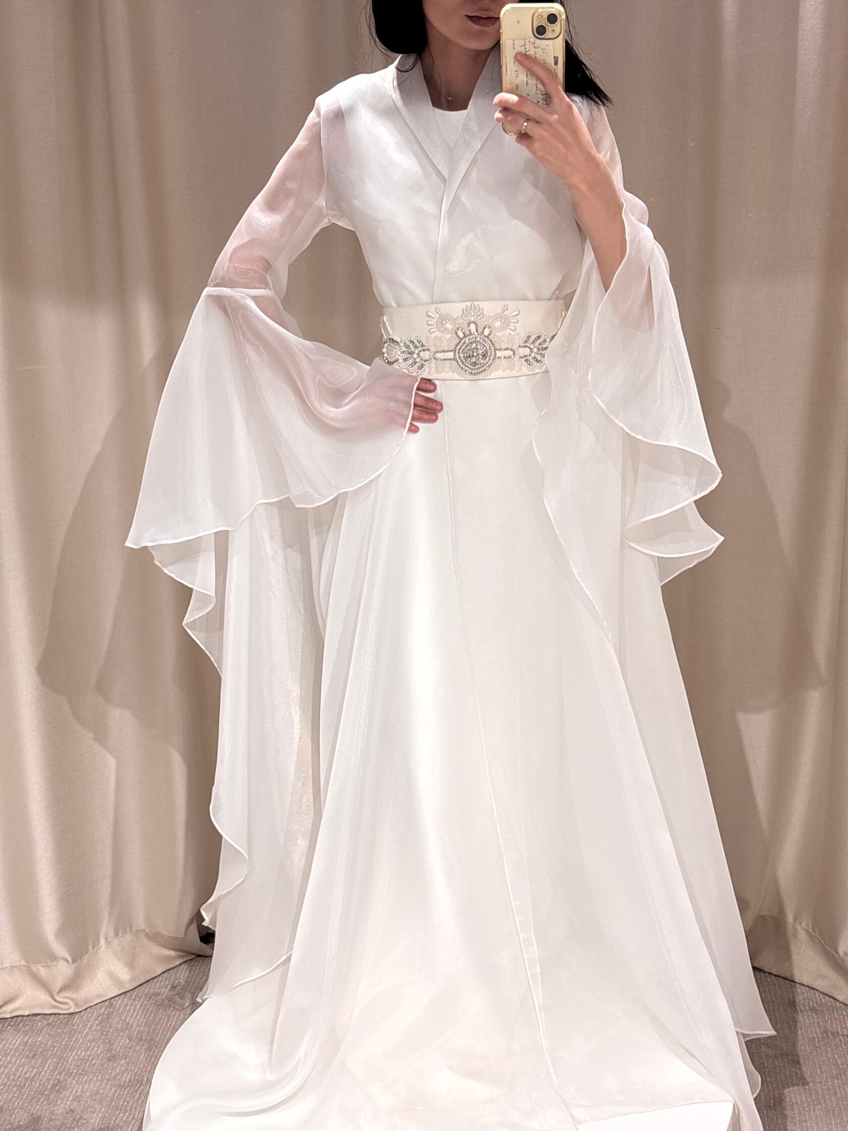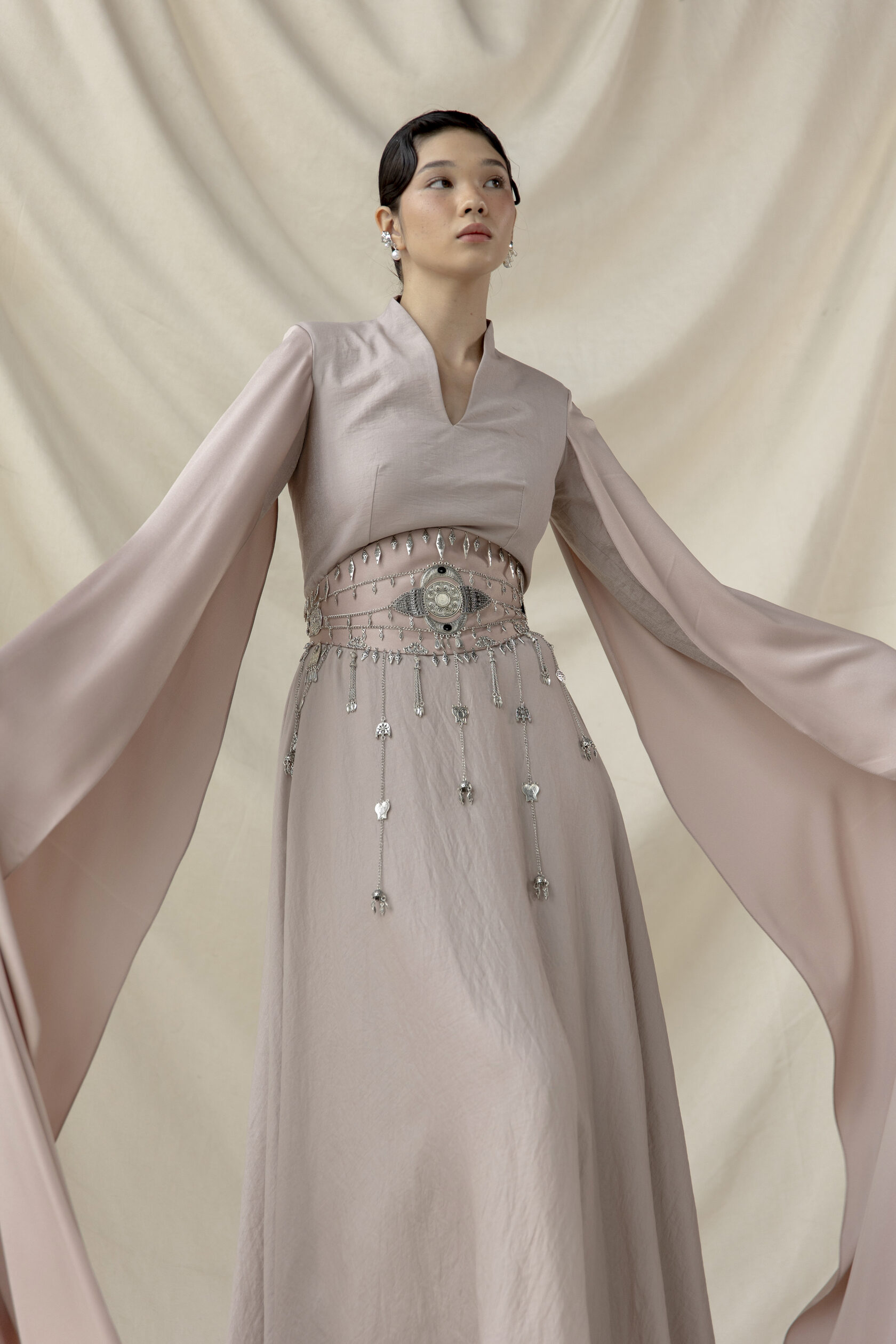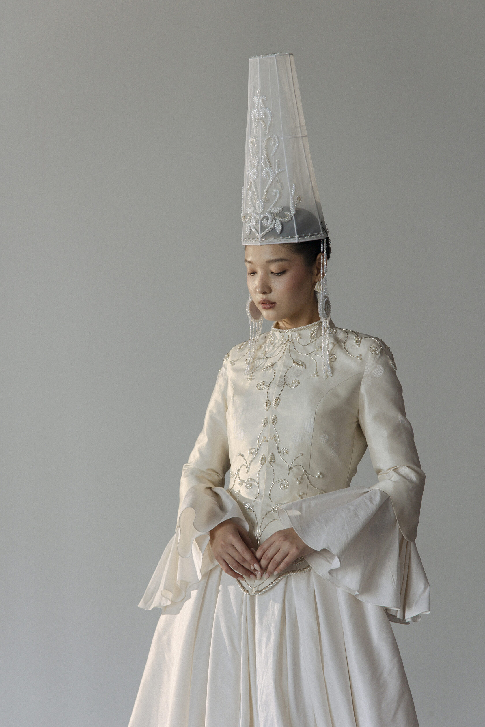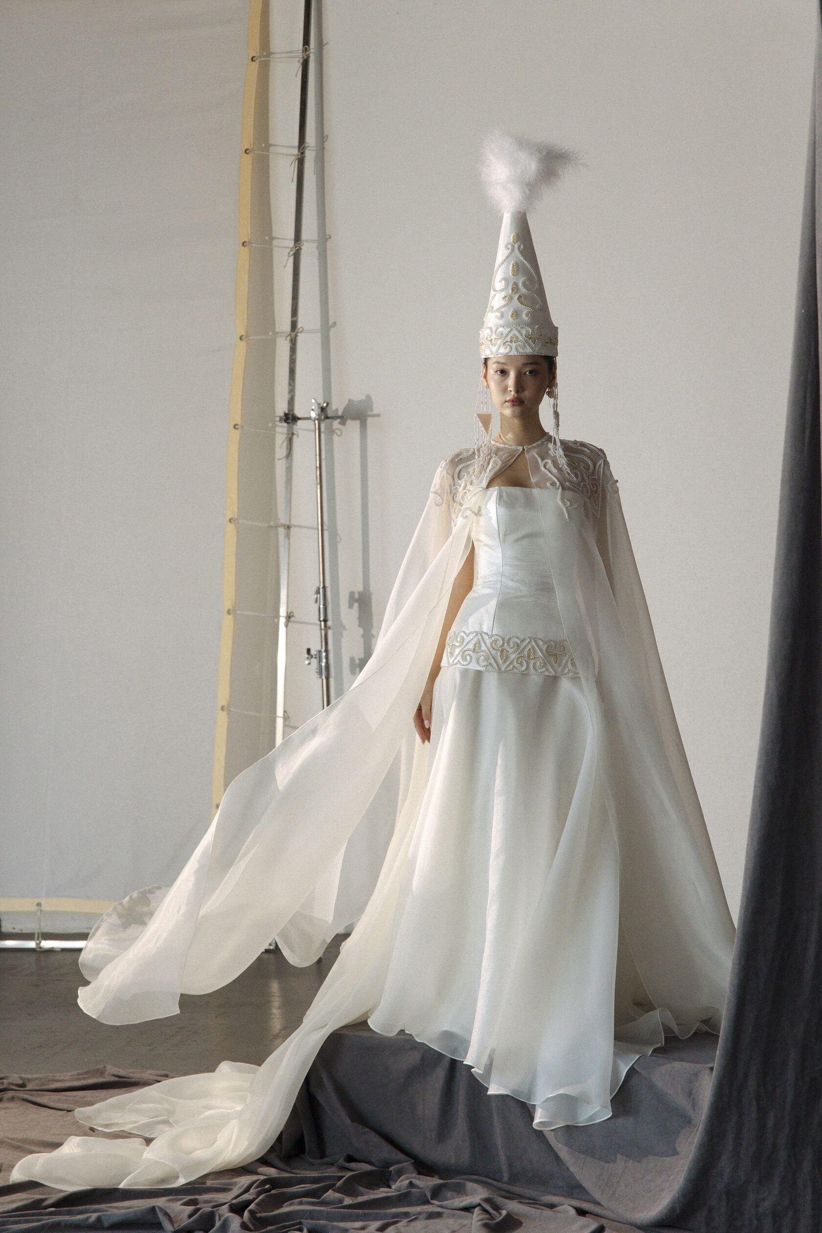 Ozgeshe - заманауи нәзіктік пен архитектуралық пішіннің үйлесімі.Жеңдерінің көлемді формасы образға драмалық әсер қосып, ал юбкадағы жұмсақ драпировка қозғалыста жеңіл ағып, салтанатты көрініс береді.