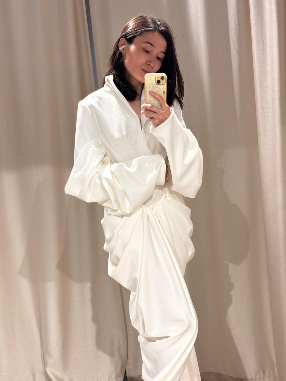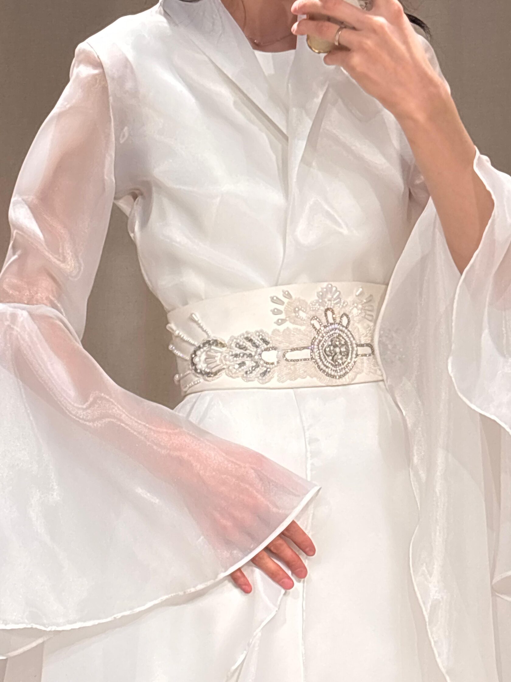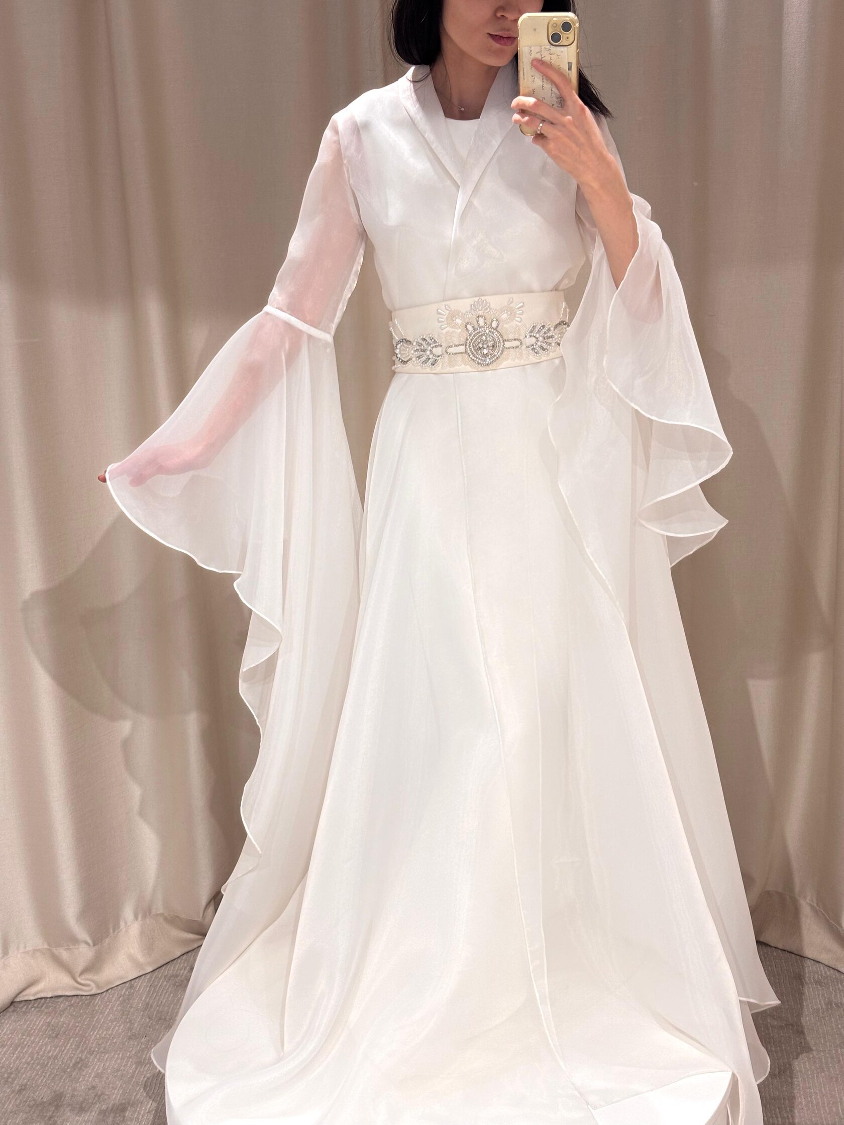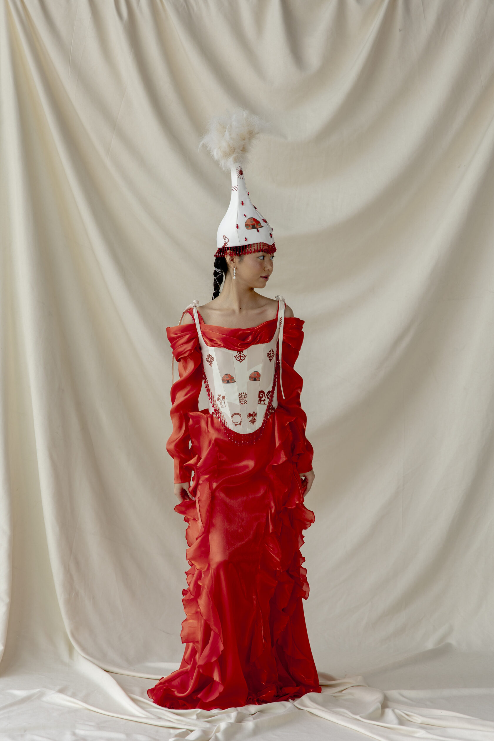 Ozgeshe - заманауи нәзіктік пен архитектуралық пішіннің үйлесімі.Жеңдерінің көлемді формасы образға драмалық әсер қосып, ал юбкадағы жұмсақ драпировка қозғалыста жеңіл ағып, салтанатты көрініс береді.