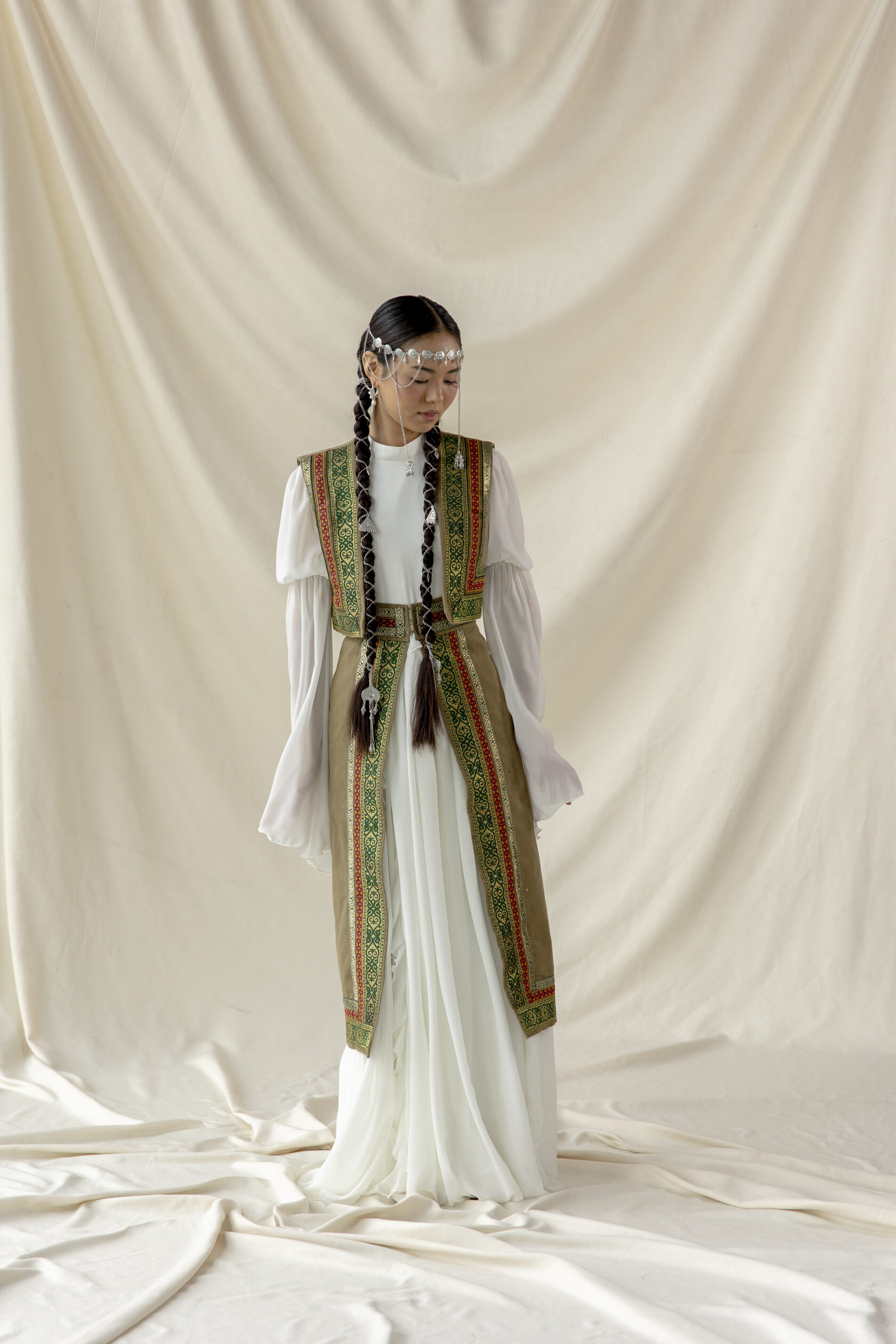 Авторлық ұзату образ. Кеудеше, белдемше және көйлектен тұрады. Жасыл және ашық қоңыр түсте бар.